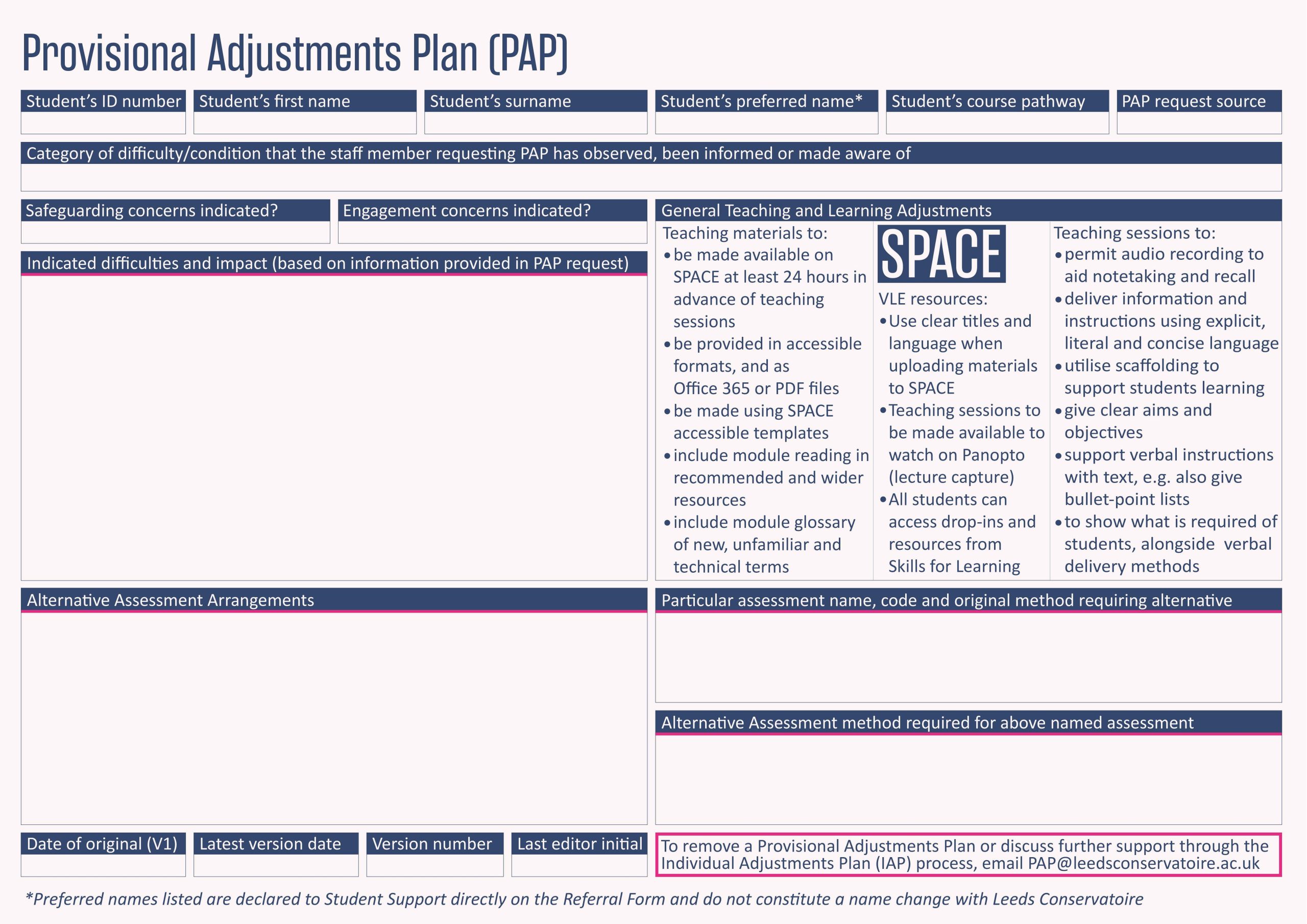 The Provisional Adjustments Plan (PAP) process at Leeds Conservatoire is part of our ongoing commitment to inclusive practices, enabling us to provide prompt assistance for: